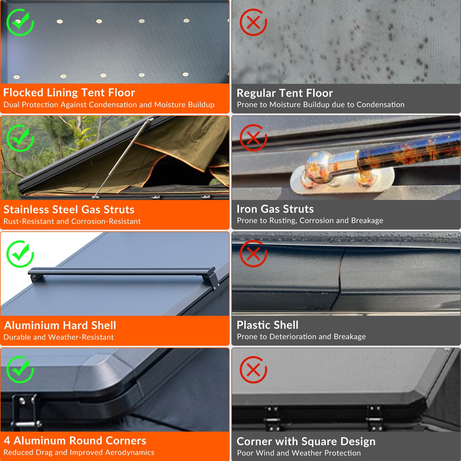 1.Aluminium Hard Shell with Aluminium Round Corner and Stainless Steel Gas Struts: Durable and built to endure the ever-changing season.
